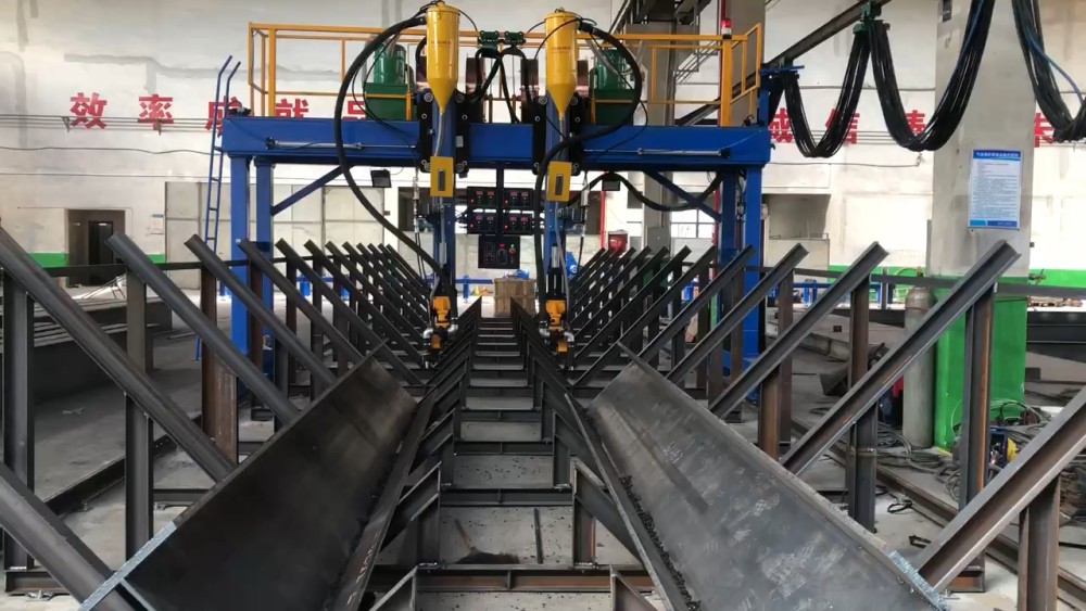 Портальный сварочный аппарат в основном предназначен для сварки под флюсом собранных двутавровых балок. Две двутавровые балки размещаются на раме заготовки на внутренней стороне направляющей в положении сварки под углом 45 градусов в форме лодки → портал перемещается по направляющим с заданной скоростью сварки → для сварки используйте два аппарата для дуговой сварки под флюсом. два сварных шва одновременно → используйте направляющую дугу для автоматического отслеживания сварного шва → используйте автоматическую систему подачи и восстановления флюса.